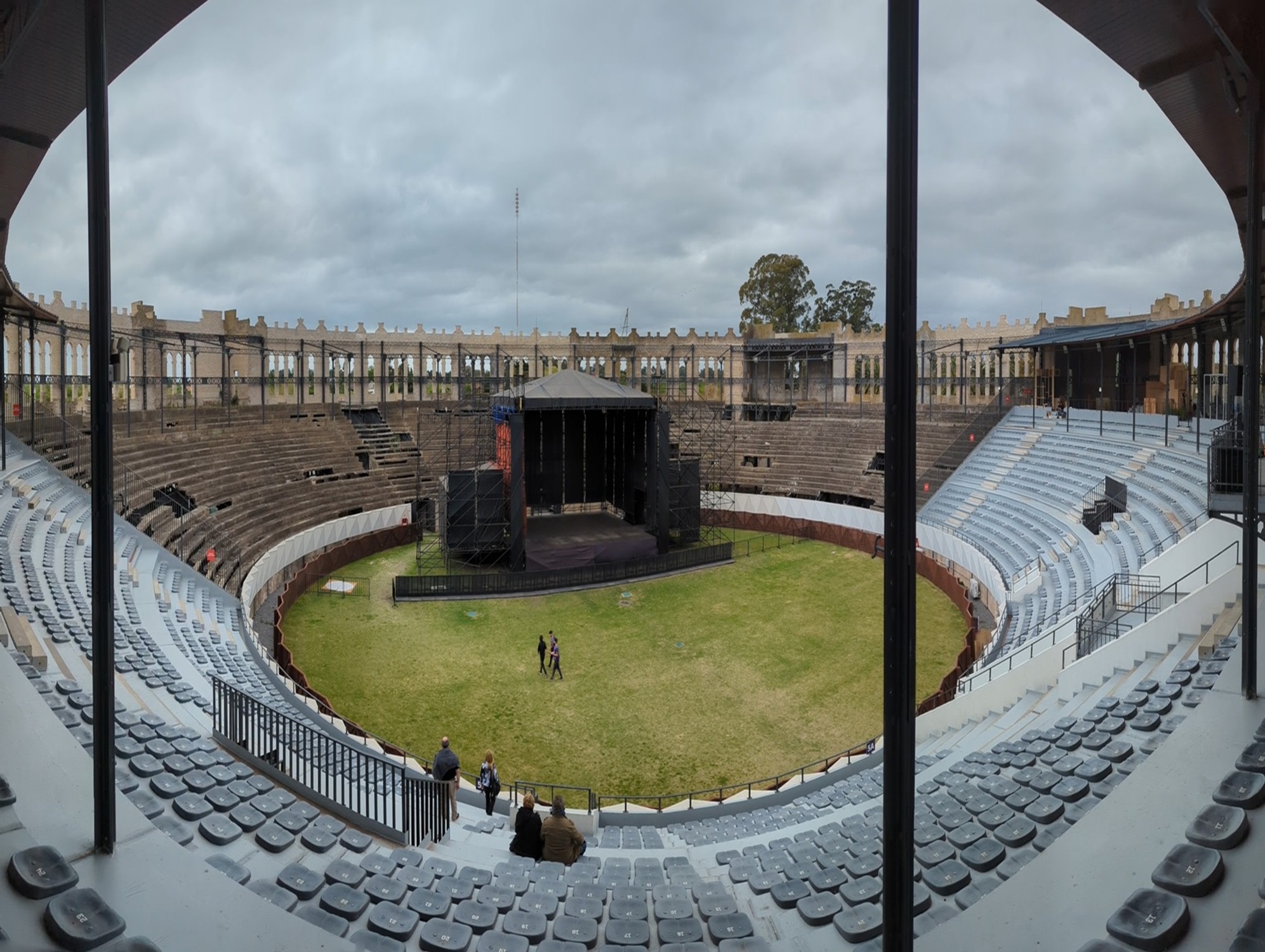 Seguimos caminando por toda la costa y nos dirigimos a uno de los sitios más curiosos de la ciudad: la Plaza de Toros Real de San Carlos, yo creo que caminamos más de dos horas, obviamente con paradas a comer algo y descansar. Aunque ya no está en funcionamiento como plaza de toros (de hecho, solo funcionó por un par de años a inicios del siglo XX), su arquitectura de estilo morisco impresiona. Hicimos un pequeño tour por el interior —vale mucho la pena— donde aprendimos sobre su historia, su abandono, su recuperación y cómo hoy funciona como centro cultural y espacio de eventos. El contraste entre el hierro oxidado original y las nuevas estructuras de madera que la refuerzan le da un aire muy especial, como de ruina viviente.
