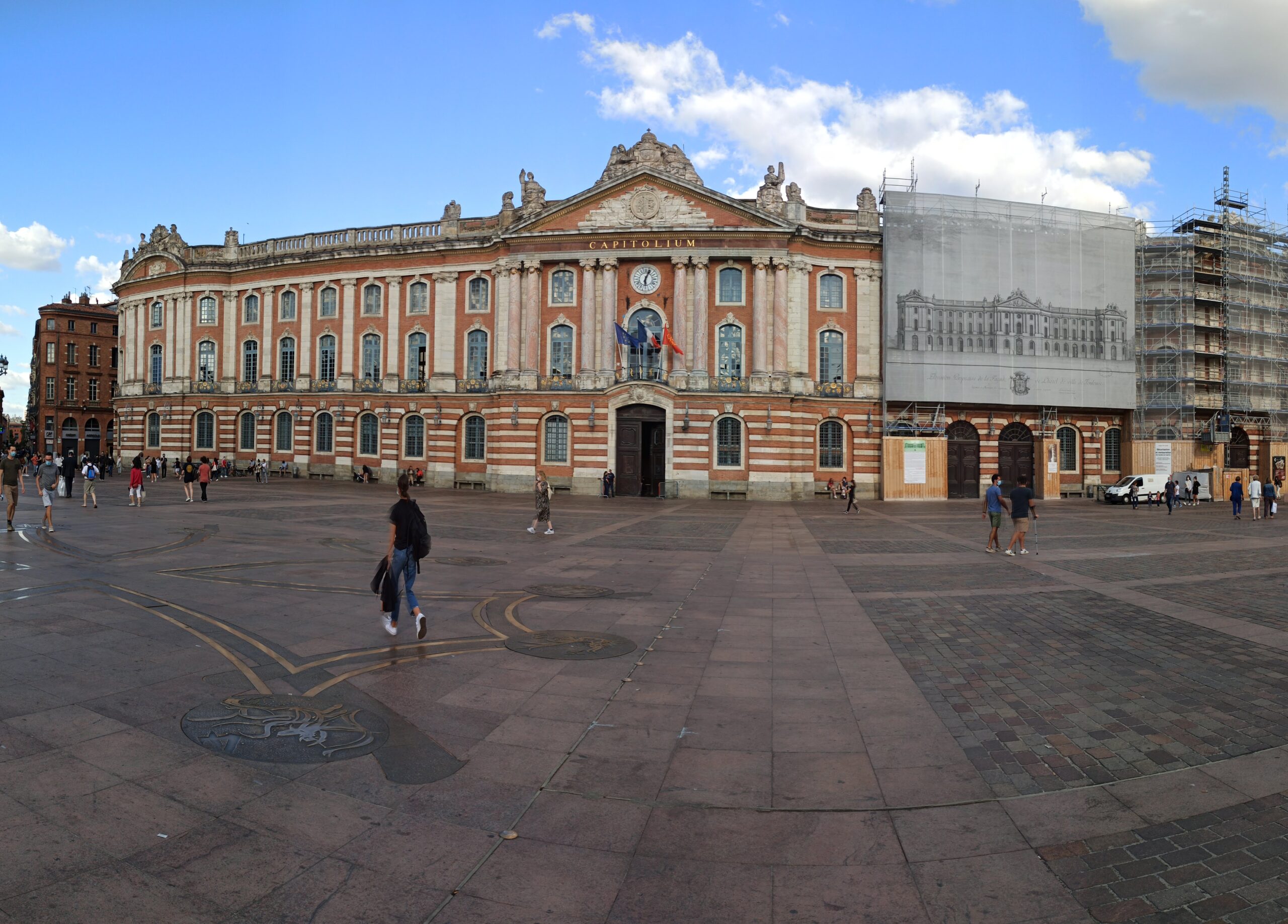 El corazón de la ciudad sería la plaza del Capitolio, allí está la alcaldía de Toulouse, no sé exactamente qué días pero podrán encontrar una especie de mercado, unas carpas blancas con souvenires, ropa, algo de comida y demás; además frente a la alcaldía hay pasillo lleno bares, cafés y restaurantes, lo más interesante es que el techo del pasillo está divido en cuadros, cada cuadro tiene una pintura que refleja algo representativo de la ciudad (el rugby, Gardel, los exiliados españoles, etc.), es una pequeña galería pública al aire libre.