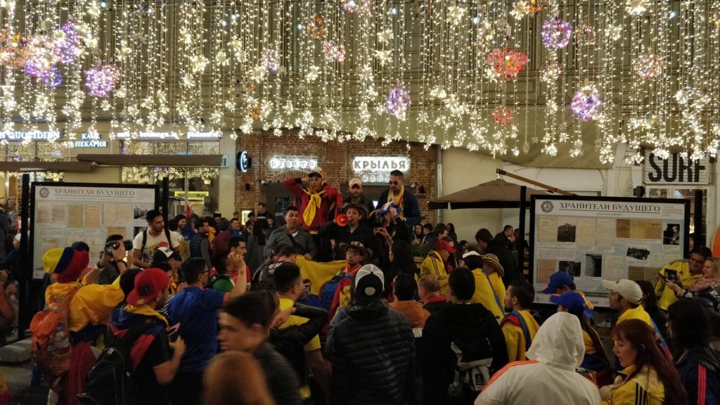 El ambiente del mundial se seguía cocinando, las estaciones de tren seguían llenas de turistas con sus respectivas camisetas, el punto de encuentro era la plaza roja que cada tarde se llenaba de cantos y bailes de diferntes partes del mundo, además el reloj con la cuenta regresiva para el pitido inicial llenaba de expectativas y ansiedad a los hinchas y viajeros que llegaban a acompañar a sus selecciones, el ambiente de carnaval y fiesta era increíble y es algo que ojalá todos pudieramos vivir al menos una vez en nuestras vidas, todos aquí eramos amigos aunque jamás nos hubieramos visto, todo el mundo quería fotos con alguien que tuviera otra camiseta, era imposible no dejarse llevar por la emoción que causa el fútbol y más en un evento como estos.