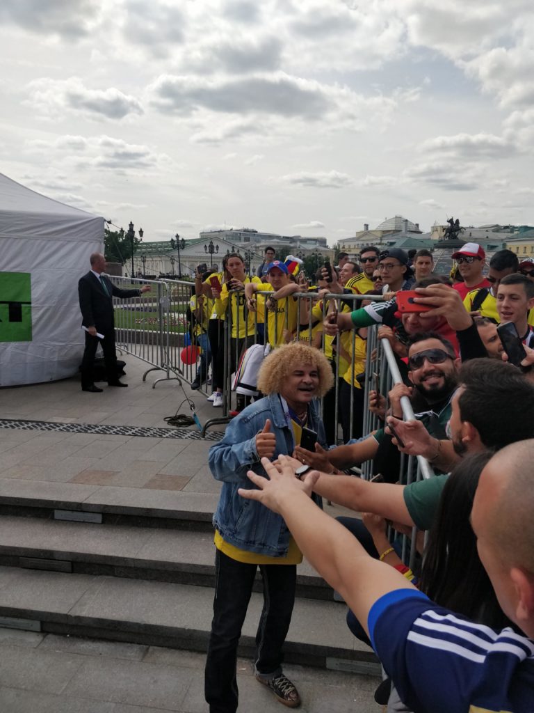 Para los que no conocen, este señor es Carlos Valderrama (El Pibe)es uno de los ídolos del fútbol colombiano mucho antes de que apareciera James o Falcao, este señor tenía una elegancia magnífica para hacer pases y jugar, pues bueno tuve la oportunidad de verlo y tomarme una foto con él en pleno Moscú.