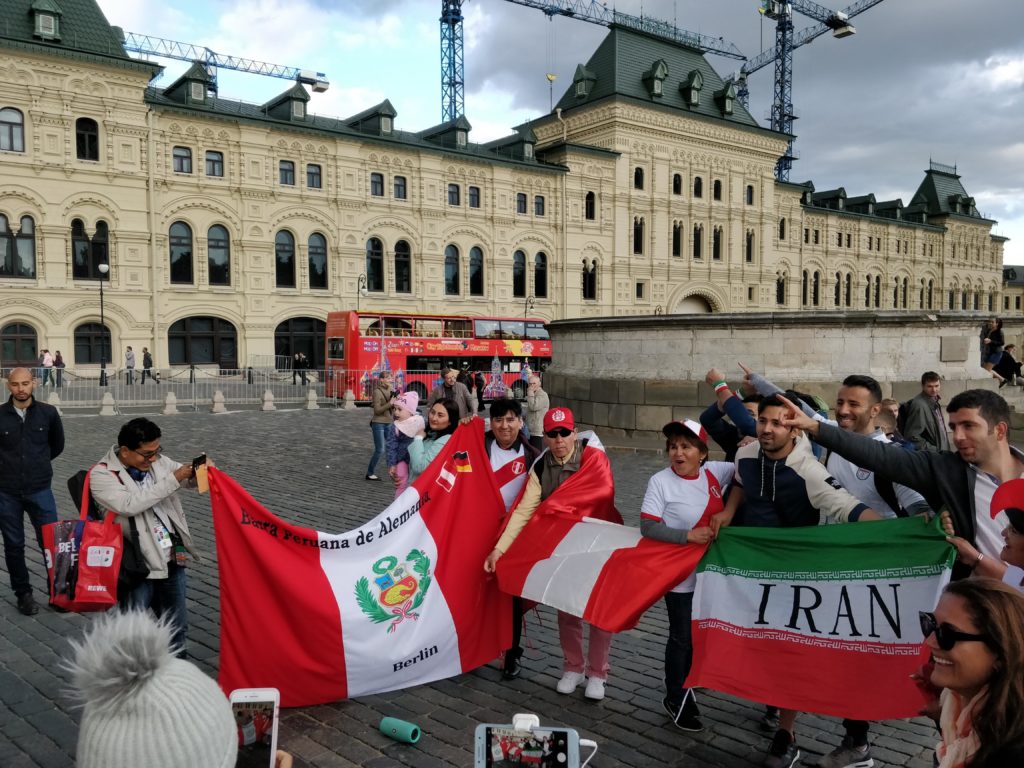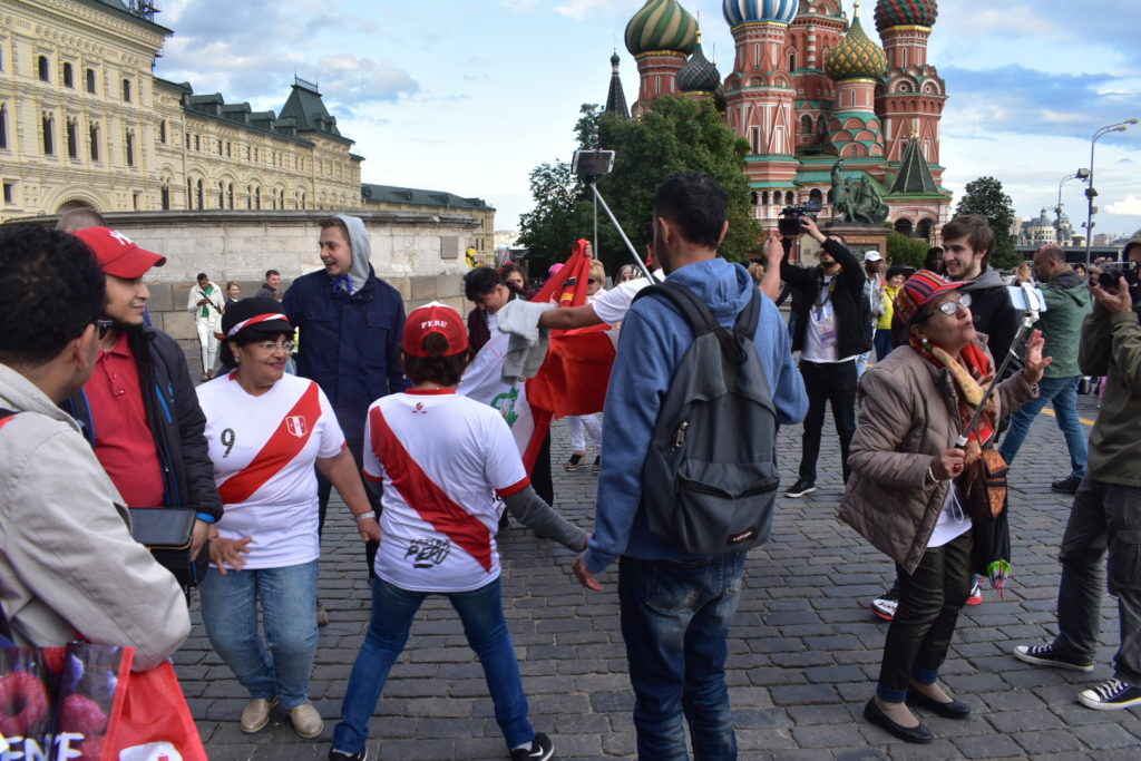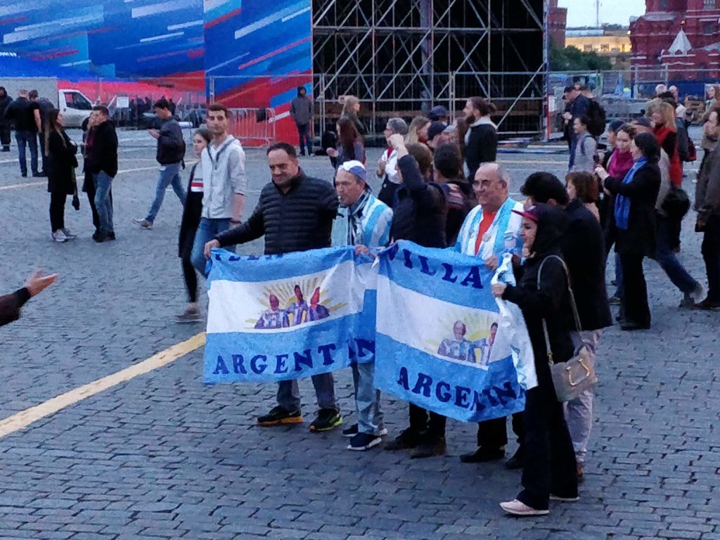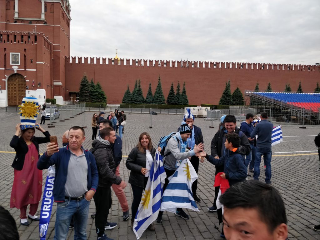 En la principal plaza de la ciudad, La Roja, también había grupos de diferentes nacionalidades, aunque una parte también estaba cerrada pues estaban montando una estructura con forma de silletería (seguramente para disfrutar los partidos allí). Nos llamó particularmente la atención un grupo del Perú que además de los cantos tenían música de allí y bailaban todos juntos, también había un gran grupo de uruguayos, algunos africanos y por supuesto colombianos, con ellos nos juntamos y esperamos que llegaran otros hasta formar un grupo grande, compartimos nuestras experiencias llegando a Rusia y luego nos fuimos todos a caminar por lo alrededores de la plaza.